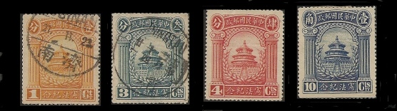 The Temple of Heaven is one of many structures in a large park outside of Peking, China. The pictures above are stamps showing the original structure. The lower right picture shows the second building after the original was burnt to the ground. The upper right set depicts the modern-